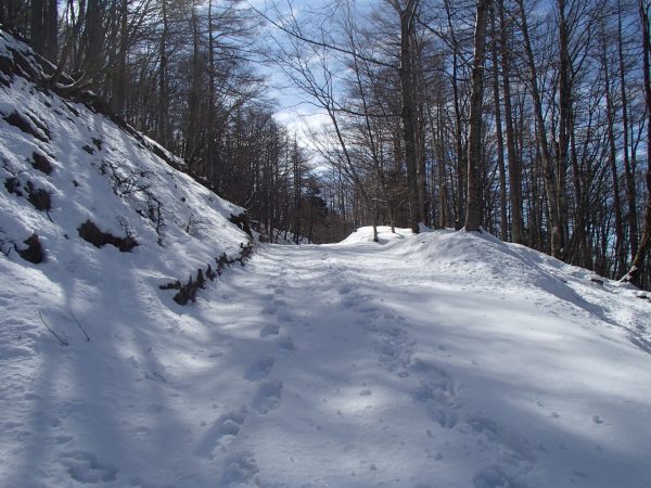 林道には車のタイヤの跡がありました。帰りはスノーシューを脱いだのでありがたく利用させていただきました。