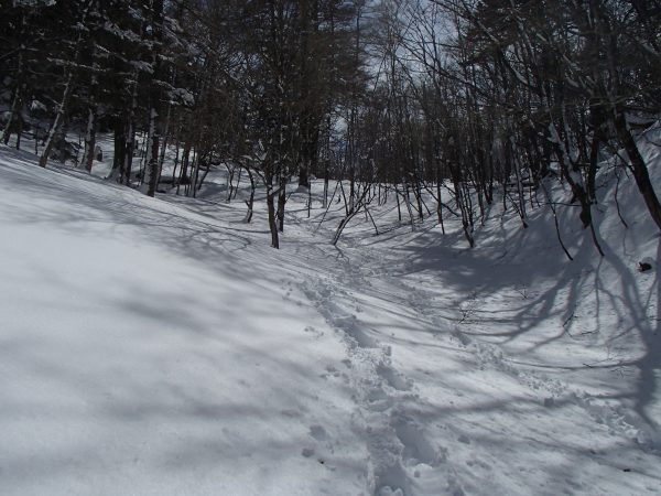 しかし、猪の段から登山道に入ると嬉しいことに雪も深くなってきました。